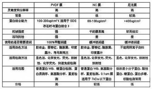 兩類膜可供選擇:硝酸纖維素膜和PVDF膜(正電荷尼龍膜),根據不同需要選擇(下表),PVDF膜需要浸泡甲醇中1-2分鐘,再孵育于冰冷的電轉緩沖液中5分鐘,膠也需在冰冷的電轉緩沖液中平衡3-5分鐘,否則轉膜時會導致條帶變形。