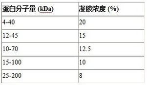 不同分子量的蛋白選擇不同的凝膠濃度(參考下表),原則上高分子量蛋白用低濃度膠,低分子量蛋白用高濃度膠分離。