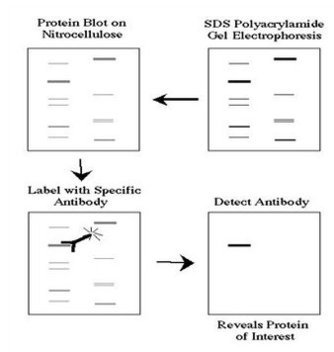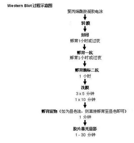 Western Blot與Southern印跡雜交或Northern印跡雜交方法類似,但Western Blot采用的是聚丙烯酰胺凝膠電泳 ,被檢測物是蛋白質,“探針”是抗體,“顯色”用標記的二抗。經過PAGE分離的蛋白質樣品,轉移到固相載體(例如硝酸纖維素膜NC膜 )上,固相載體以非共價鍵形式吸附蛋白質,且能保持電泳分離的多肽類型及其生物學活性不變。以固相載體上的蛋白質或多肽作為抗原,與對應的抗體起免疫反應,再與酶或同位素標記的第二抗體起反應,經過底物顯色或放射自顯影以檢測電泳分離的特異性目的基因表達的蛋白成分。該技術也廣泛應用于檢測蛋白水平的表達。其圖解為: