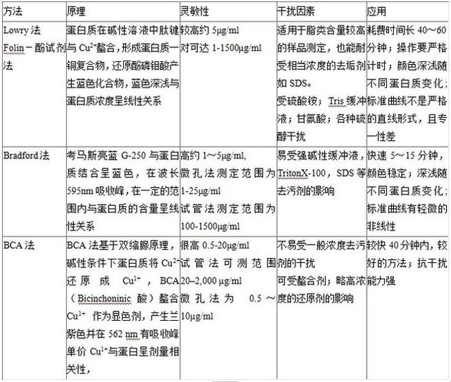 Bradford 法 Lowry 法或BCA 法 (操作簡單、需分光光度計或酶標儀),小牛血清白蛋白 (BSA) 作為標準曲線。如果裂解液中有NP40或其它表面活性劑,則推薦使用BCA 法。三種方法或產品比較