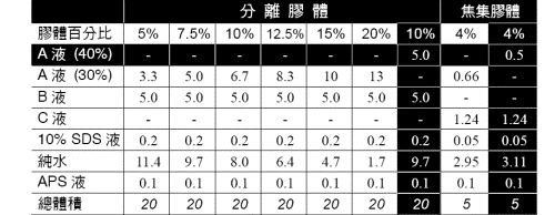 2) 三明治組合后直立站好,準備所要濃度的SDS 膠體溶液如表4.2. 兩片0.75mm 厚的平板膠片約需10 mL 分離膠體溶液,以及5 mL 焦集膠體溶液。APS液到**后才加入,未加APS 以前可在真空中抽去溶液中的氣體。