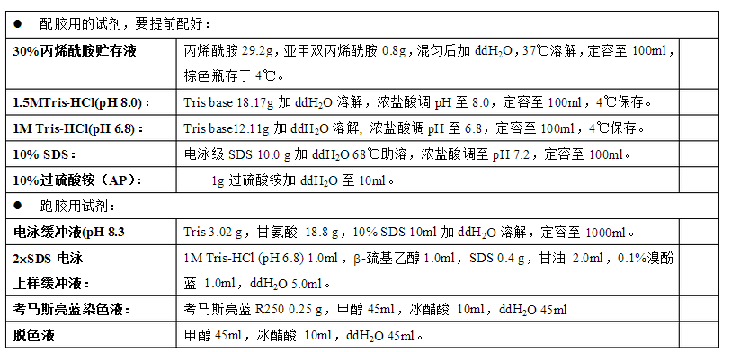 2、為達到較好的凝膠聚合效果,緩沖液的pH值要準確,10%AP在一周內使用。室溫較低時,TEMED的量可加倍。 3、未聚合的丙烯酰胺和亞甲雙丙烯酰胺具有神經毒性,可通過皮膚和呼吸道吸收,應注意防護。 試劑配制:
