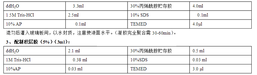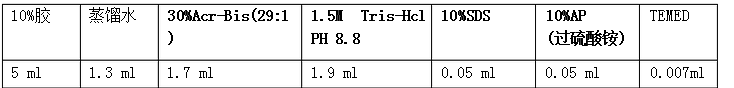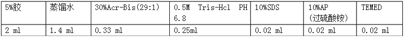 ? 5 % SDS-PAGE 濃膠:30%丙烯酰胺0.5 mL、去離子水2.1 mL、0.5mol/L Tris-HCl(pH6.8)0.375 mL、10 % AP