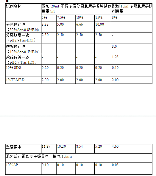 ?2.配膠:根據所測蛋白質分子量范圍,選擇適宜的分離膠濃度。本實驗采用SDS-PAGE不連續系統,按下表的配制分離膠和濃縮膠。 ?