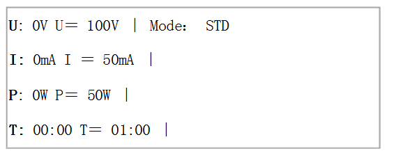 其中:左側大寫U: I: P: T: 為電泳時實際值;中間部分顯示程序的常設值(預置值)。Mode(模式):STD(標準);TIME(定時);VH(伏時);STEP(分步)