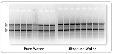 在實驗中,來自大腸桿菌的 rRNA將其加載到瓊脂糖凝膠上。用兩種類型的水制備凝膠和緩沖液:純凈水(類型2)和超純水(類型1)。結果如圖1所示。在超純水制備和運行的凝膠中,獲得了更高的信號/譜帶強度。